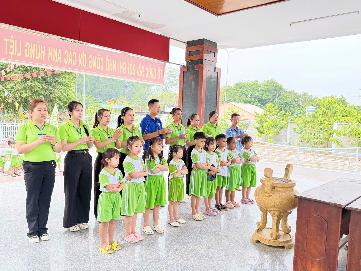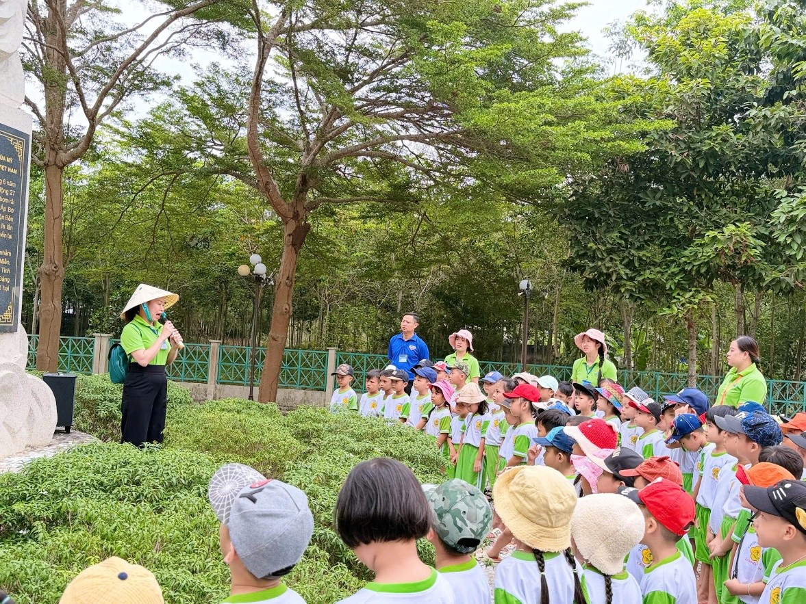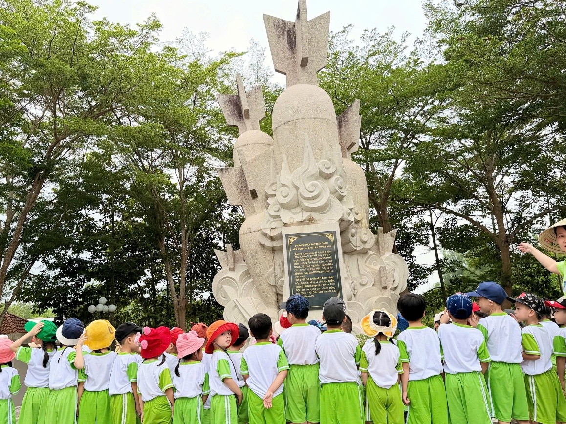 Tại Di tích Bia tưởng niệm B52, các bé đã được lắng nghe những câu chuyện lịch sử giản dị, gần gũi, giúp các con hiểu hơn về ý nghĩa của di tích. Trong không khí trang nghiêm, các bé cùng nhau xếp hàng ngay ngắn, thành kính tham gia lễ dâng hương, thể hiện lòng biết ơn đối với các thế hệ cha ông đã hy sinh vì độc lập dân tộc.